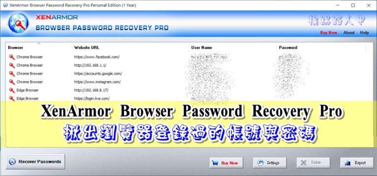 XenArmor Browser Password Recovery Pro 是一套相當不錯的密碼搜尋工具,主要針對瀏覽器中儲存所有網站登錄密碼的蒐尋,目前專業版支援 Chrome、Firefox、IE、Edge、Safari、Opera..等超過70個瀏覽器,此外,它還可以防止您的密碼被勒索軟件或黑客竊取,目前限時免費中。