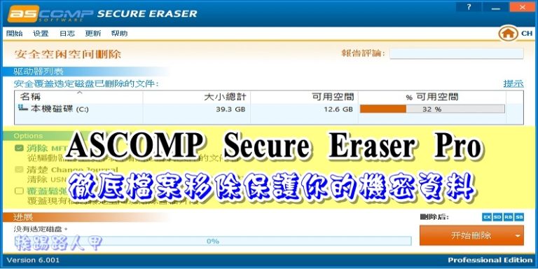 大部分的人以為都從資源回收筒內刪除檔案就安全了,眾所周知,Windows系統刪除檔案的動作並非真的刪除,也就是說看不到並不代表儲存裝置上就沒有哦!想要完全的刪除檔案嗎? ASCOMP Secure Eraser Pro 是一套可徹底刪除檔案與資料夾的工具,目前限時免費喔!